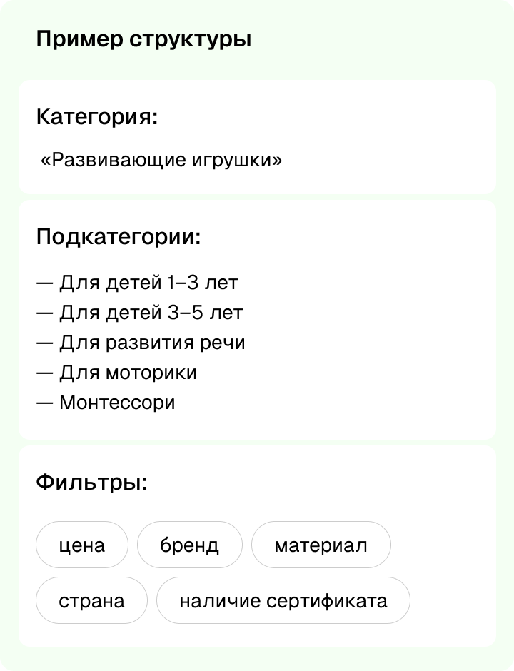 Каталог должен быть логичным и масштабируемым, учитывать тип товара (одежда, товары для новорожденных, куклы, машинки, настольные игры, мягкие игрушки), возраст и пол ребенка, назначение, бренд.