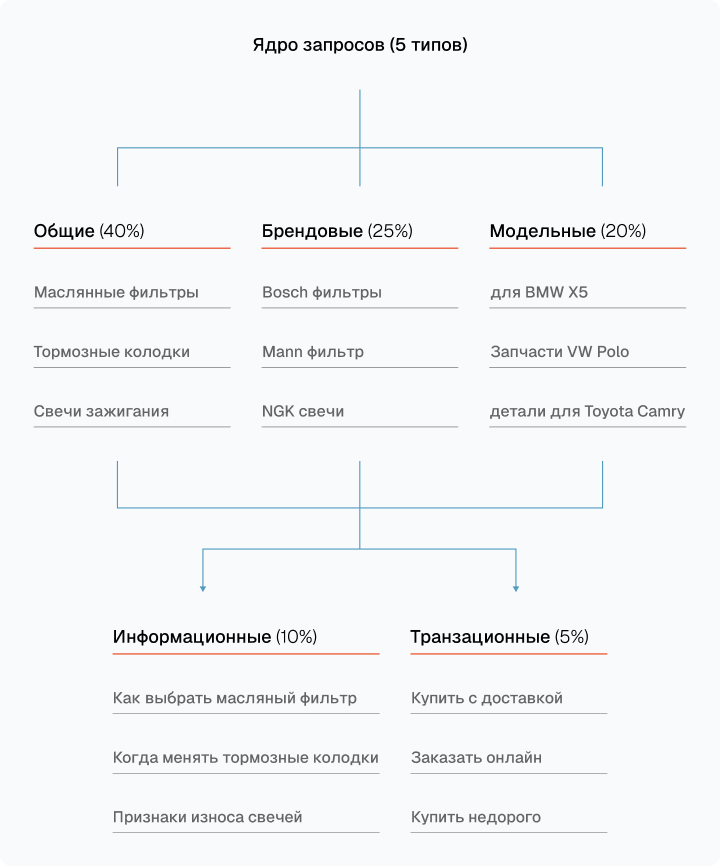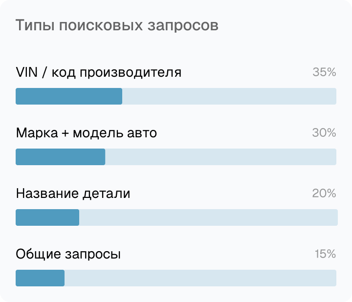 Поисковое поведение идет в нескольких направлениях. Кто-то ищет запчасть по названию, кто-то по коду производителя, кто-то по марке и модели машины, а некоторые даже по VIN.