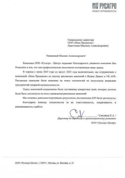 Компания ООО "Русагро - Центр" выражает благодарность диджитал компании Idea Promotion в том, что они профессионально выполняли поставленные нами задачи.