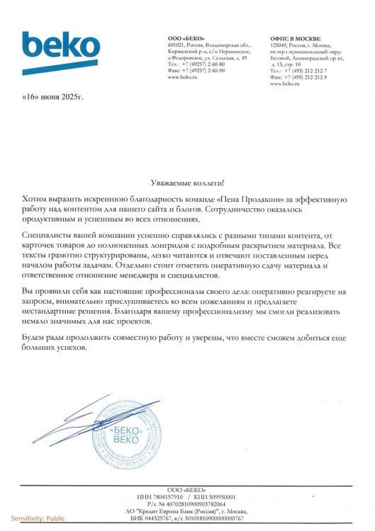 Хотим выразить искреннюю благодарность команде "Пена Продакшн" за эффективную работу над контентом для нашего сайта и блогов. Сотрудничество оказалось плодотворным и успешным для всех отношений.